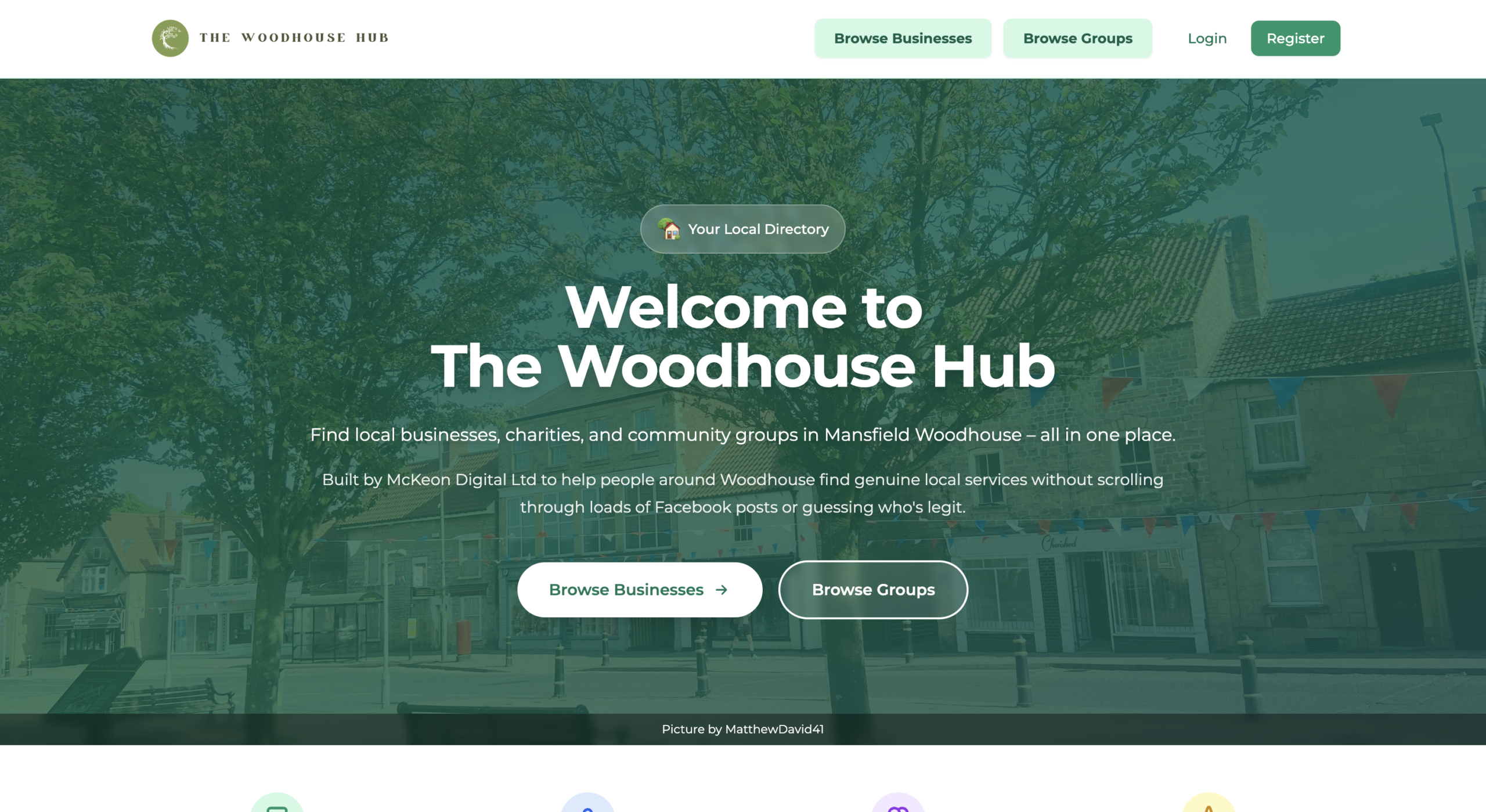 We created The Woodhouse Hub to give Mansfield Woodhouse a proper digital space where local businesses, groups, and residents can connect in one place. Instead of relying on scattered social media posts or outdated directories, the goal was to build something simple, modern, and genuinely useful for the community – showing how McKeon Digital can turn a local need into a custom-built platform.