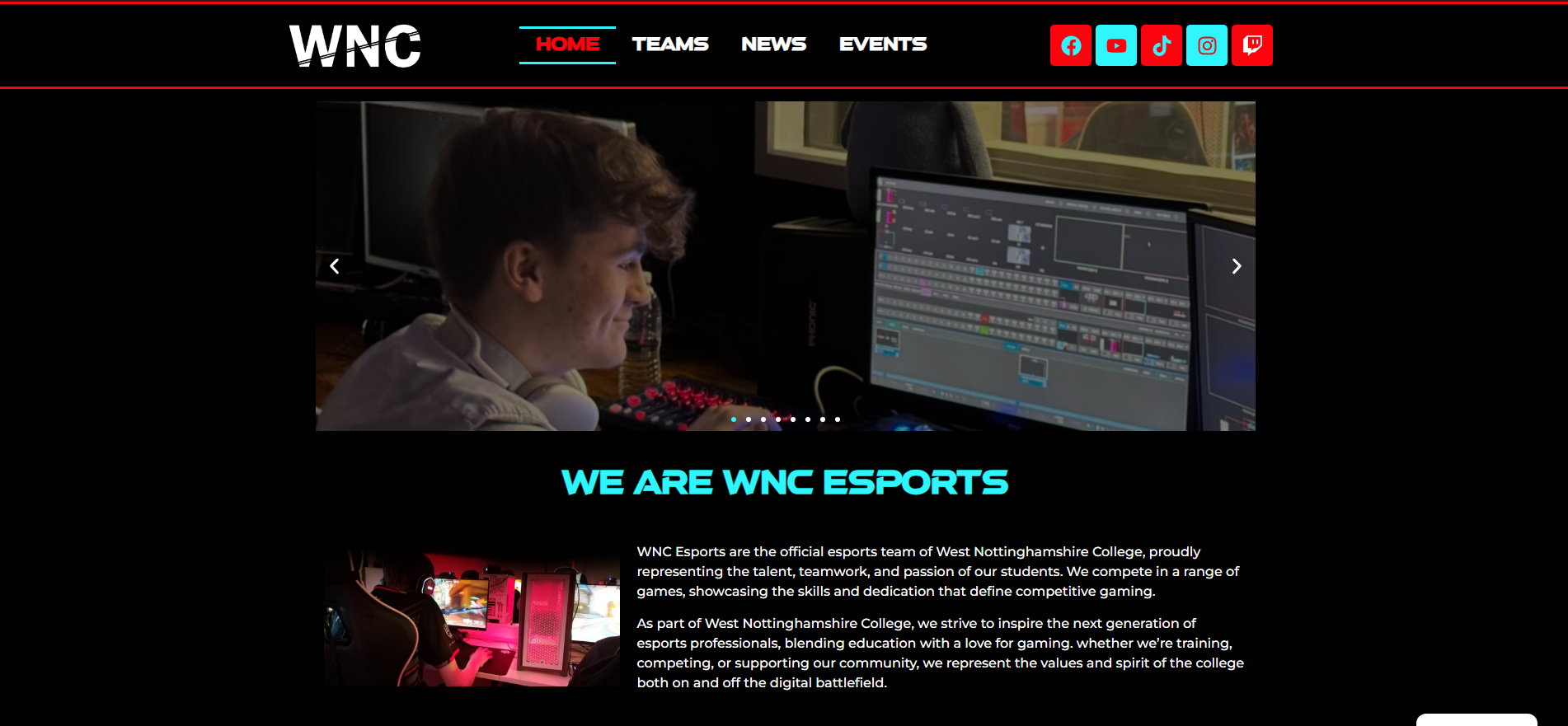 WNC Esports are a student-led esports organisation delivering weekly live broadcasts, competitive fixtures, and full event production at Vision West Nottinghamshire College.